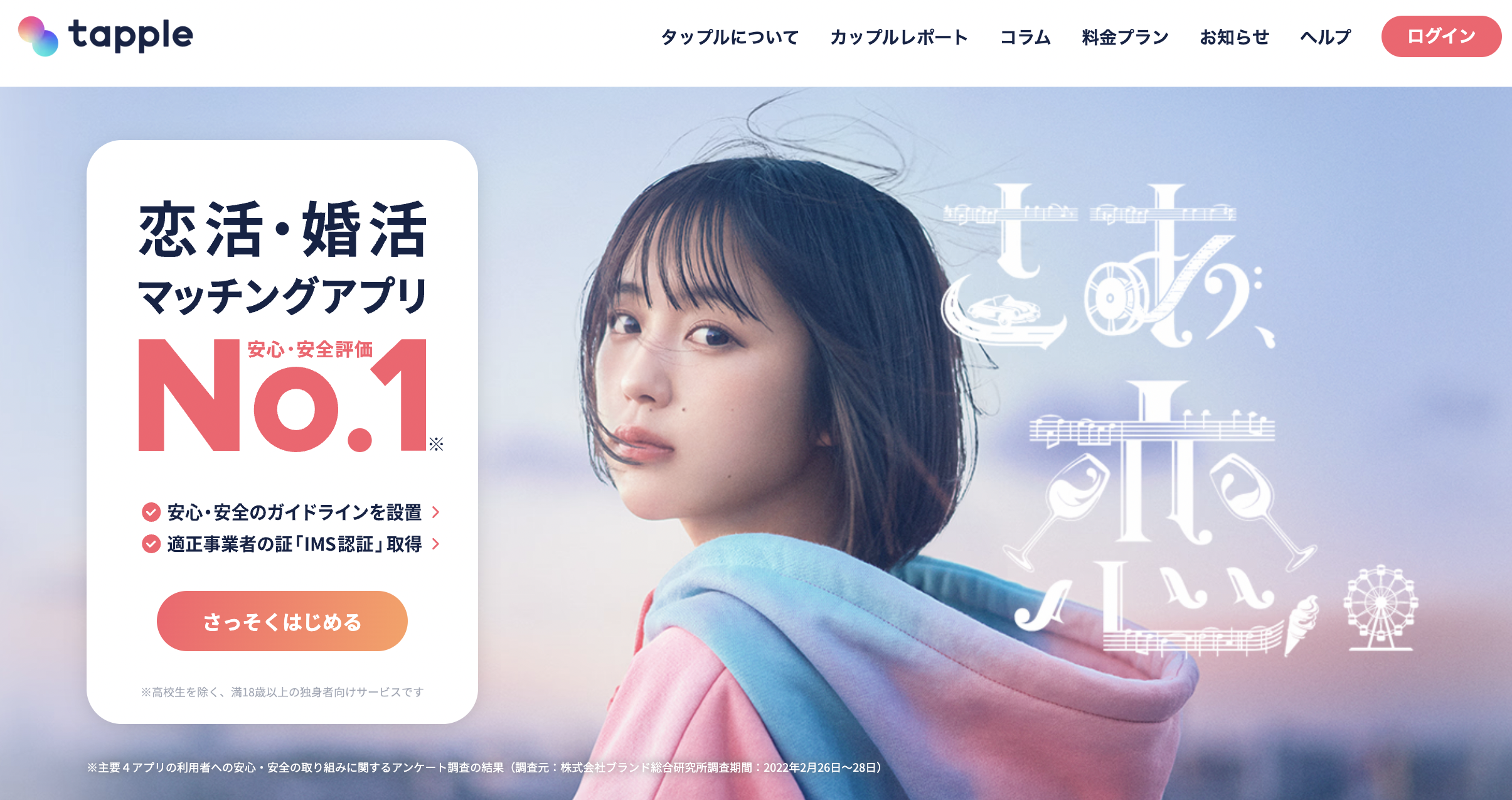 「アプリではなくブラウザだけで出会える」「本名を公開する必要がない」など、プライバシーに配慮しつつリスクを最小限に抑えた安心設計になっています。
